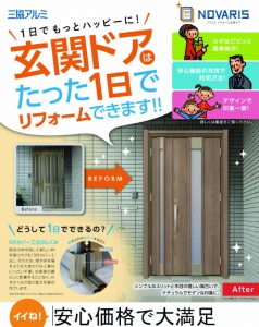 三協アルミのリフォームショップ一新助家のNOVARIS ノバリスなら、玄関ドアがなんとたったの1日でリフォーム 鍵は①ピピッと簡単操作②安心機能の充実で防犯万全家の顔、玄関が変わるだけで印象が変わります。 玄関をリフォー […]
