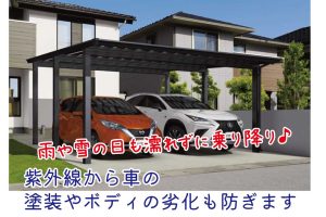 雨の日も雪の日も濡れずに乗り降りがラクラク出来るカーポート、三協アルミのスカイリードZ、他にもお気に入りのカーポートが見つかるはずです。紫外線から車のボディや塗装も守ってくれます(^^)/ 三協アルミHP